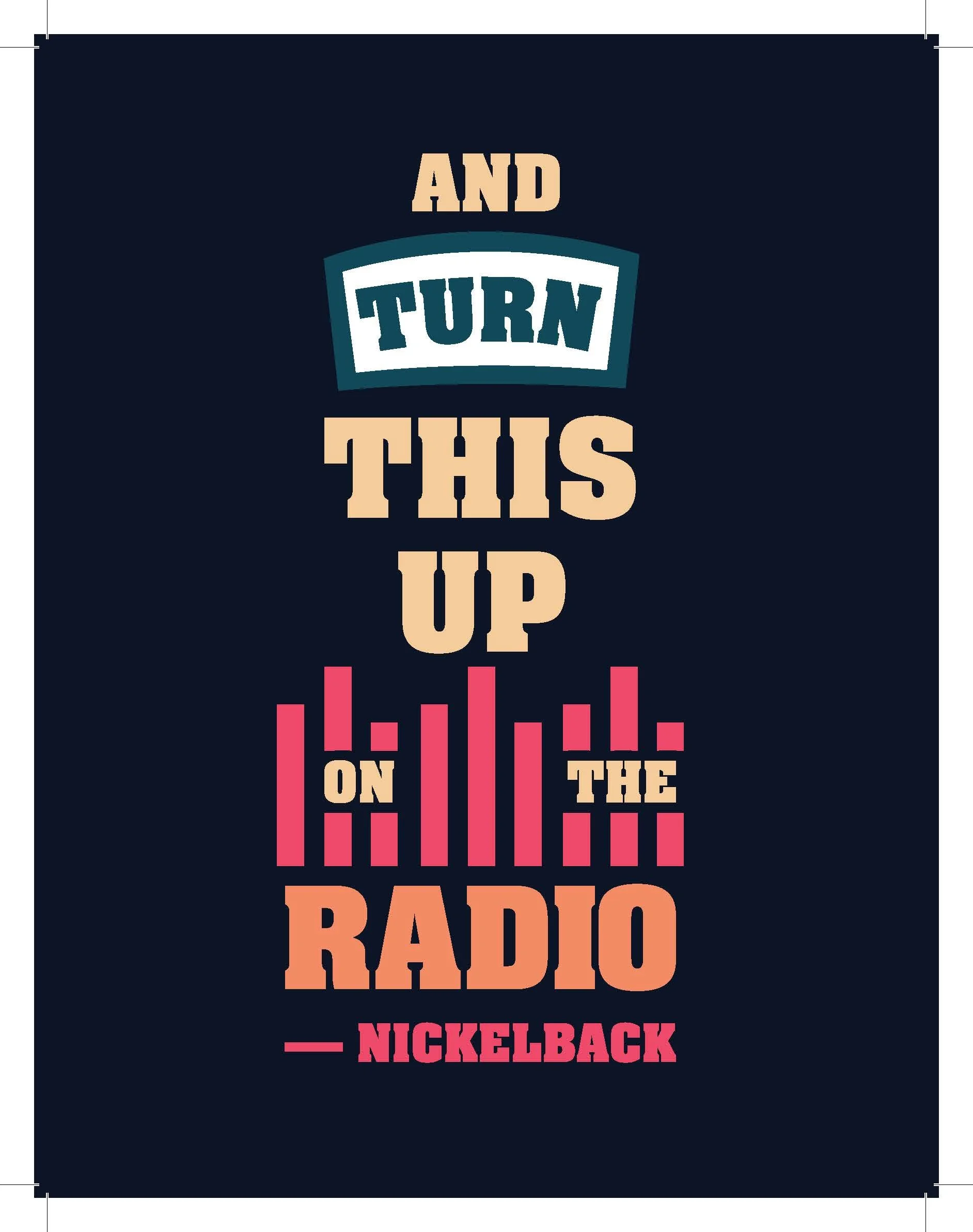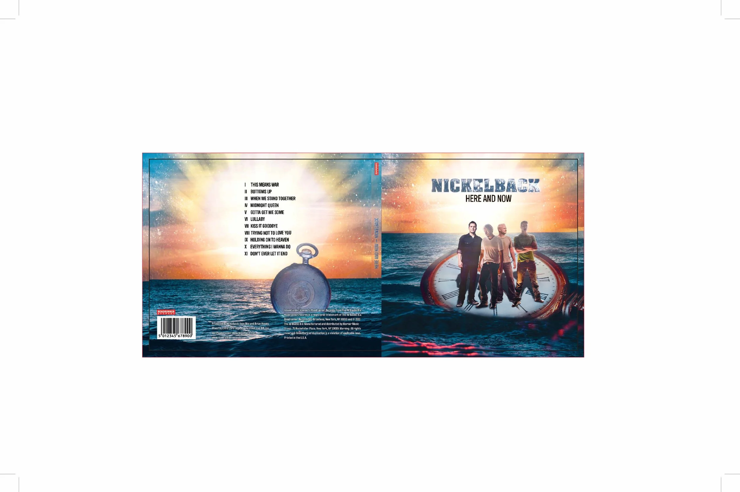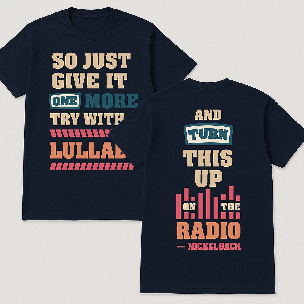For this project, I created a full redesign of Nickelback's Here and Now album packaging along with custom lyric-based merchandise. The refreshed album cover and tracklist design blend warm, radiant tones with surreal ocean imagery, creating a bold yet nostalgic atmosphere. To complement the album, I designed coordinating t-shirts featuring standout lyrics from the track “Lullaby,” using expressive typography, vibrant color blocking, and musical iconography. The overall direction reintroduces the album with a modern, emotionally resonant aesthetic that connects visually and lyrically with fans.